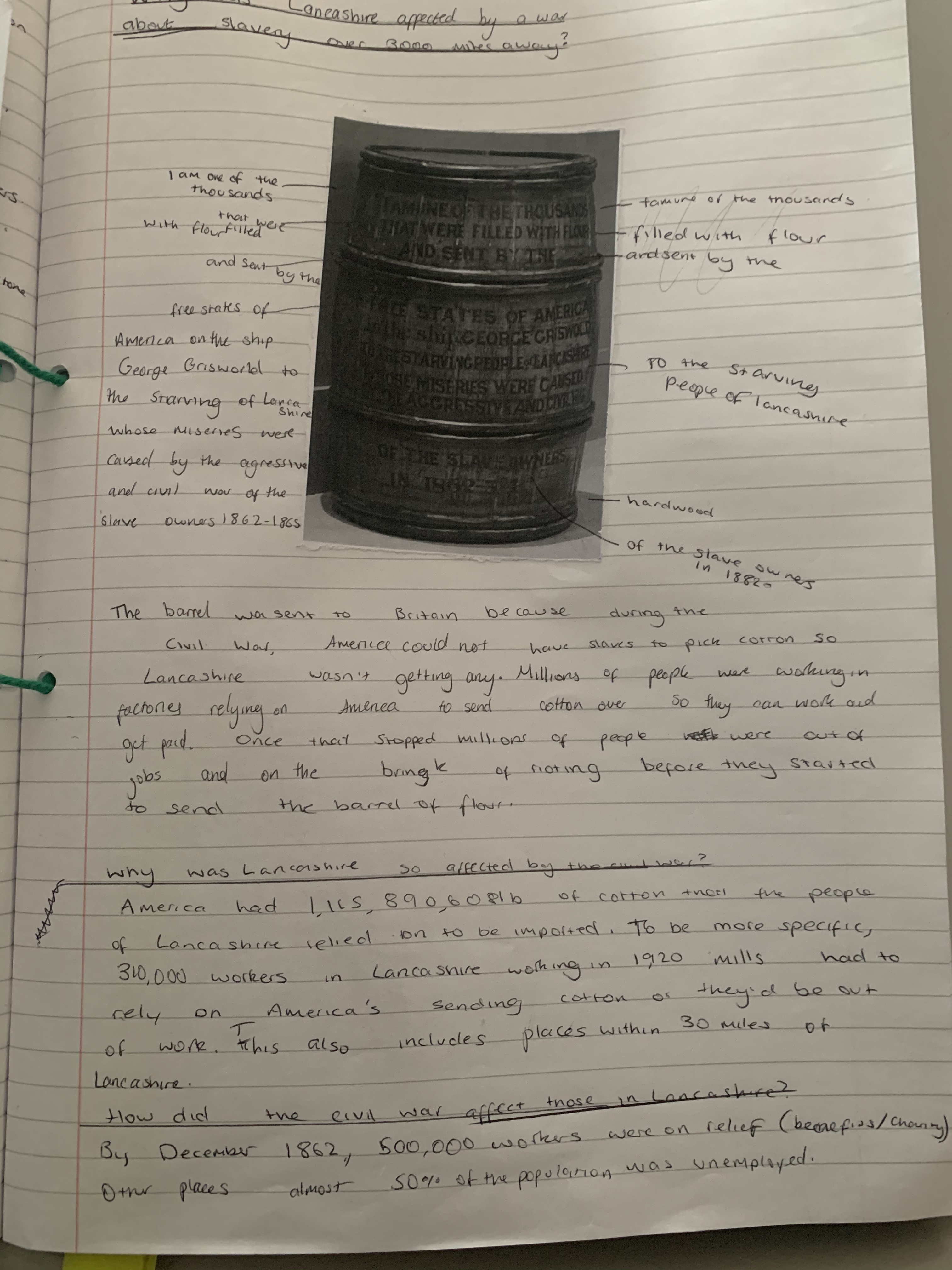 At the conclusion of studying how the Industrial Revolution affected those in Britain students are then to first study the Lancashire Cotton Famine. In this initial bridging lesson, students are initially presented with the image of the barrel of flour sent to Lancashire from the free states of America during the American Civil War. Here, the aim is to get students to bring their knowledge of the workers of the Industrial Revolution and to hypothesis any possible links (even if superficial) to the image, inferring why people might be starving in Lancashire through a thriving Industrial Revolution. It is important to note that at this point students bring no more than their own understanding of slavery and the slave trade to these discussions, they have not been taught it in lessons yet. Through discussions students were to suggest why they thought such a barrel would have been sent to Lancashire from America – what could be the reason? Why does Lancashire need aid? Why does America, a country 3000 miles away, care about the region of Lancashire?