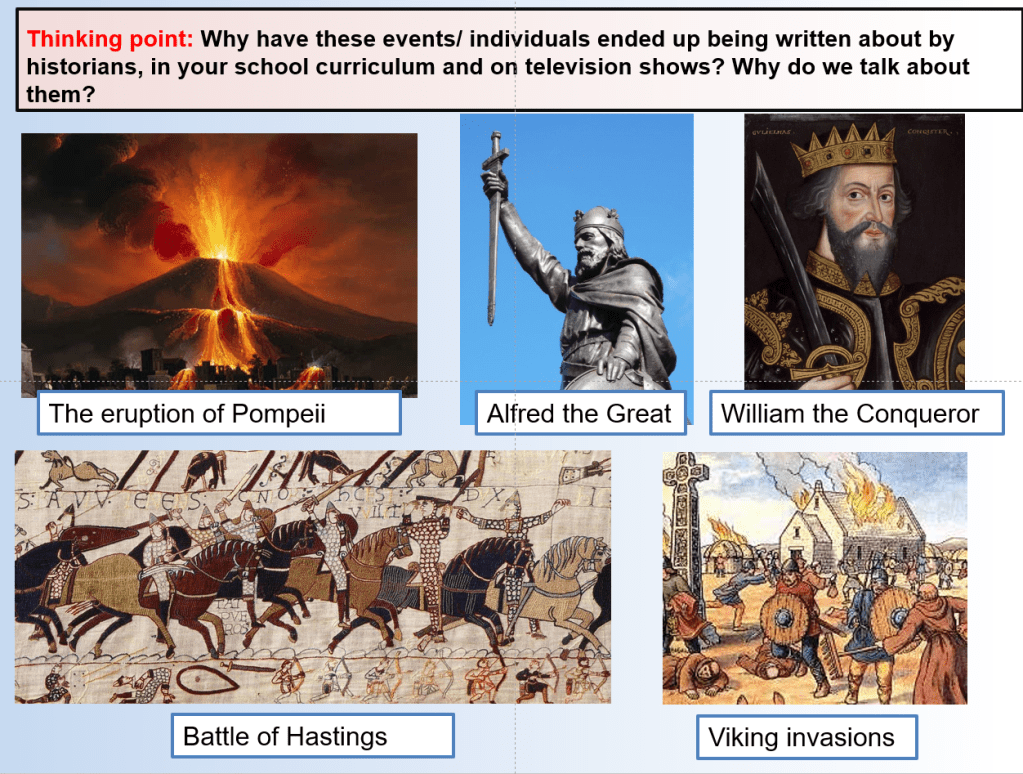 So, where did all this thinking get me? Simply, that we should explicitly talk to students about the choices we have made so that we can expose the silences we have created to our students and ensure they feel empowered in the construction of curriculum. This feels particularly important given the number of petitions to the government calling for diversification from students last year! I love Priggs’ model for doing this but I wanted to think about what I could do today, immediately, in the classroom to get these conversations occurring. My ideas came together when I saw a post by Katie Amery on Twitter where she shared some slides on a new significance enquiry that she was creating on the Peasants’ Revolt. Her first slide was a range of famous historical figures and events and got students to question why those events are in history books and television shows, but crucially, why they are in your school curriculum? This seemed to me a great way of opening up debate about curriculum construction with our students. So I decided to do the same with our first Year 7 significance enquiry, but my slide included the events we had already studied, those that were part of our curriculum.