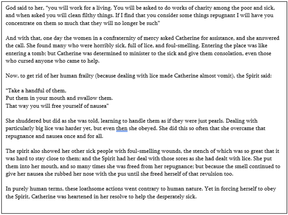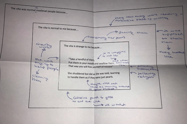 I planned each lesson around a medieval source which, at first glance, would be seen as undeniably strange. For example, an extract from the Vita of St Catherine of Genoa: