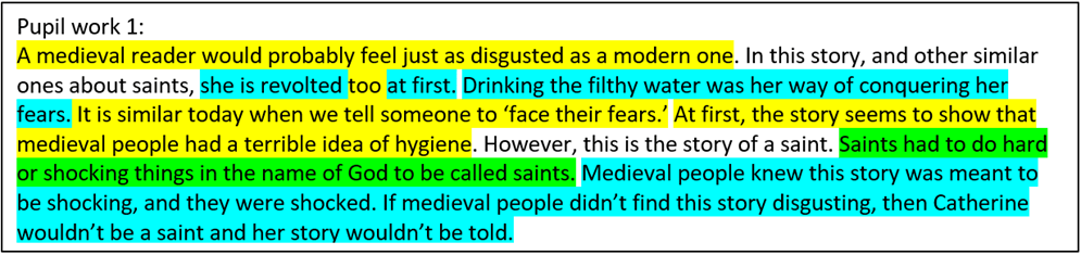 At the end of the enquiry, I asked pupils to write about the meaning behind similar but unseen sources. I found pupils wrote descriptions of past mentalities without superficial projections of presentisms but with an underlying appreciation that the medieval world had underlying familiarities which played a role in the unravelling of the period-specific meaning of each source effectively. I have made a rough attempt to show where I feel the ‘familiar within the strange’ (the conceptual content of the middle diagram layer), can be seen in pupils’ work. Where it emerges, I feel it both plays an important tool in reaching the end goal of explaining what the sources meant at the time, but also in generally capturing the humanity and vibrancy of the period as was my original goal.