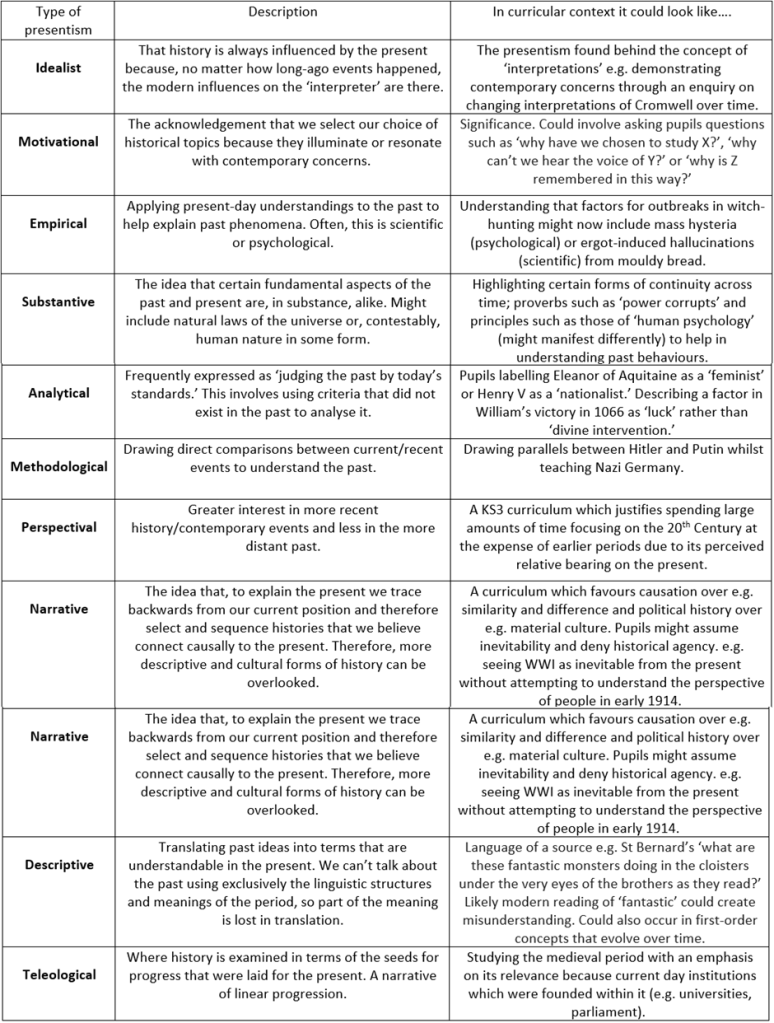 Below, I have taken the presentisms he writes about and have tried to adapt them from an academic context to a school curricular one with examples.* Within the taxonomy, I have very roughly placed those I think could play a constructive role in the classroom nearer the top, and those which run the risk of being destructive further down. This is obviously difficult because, for many, the value depends on the context in which they are used. It is definitely an area for further discussion and theorisation.