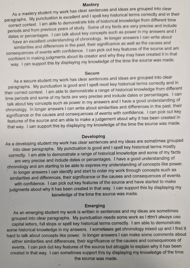 To mark this final question we drew on the old national curriculum we wrote four summary descriptor paragraphs, or levels, that pupils might fall into. These were not to be disaggregated, they were to be ‘best fit’ and, crucially, we arrived at an understanding of what we mean by them through discussion as a team of colleagues. Teachers were also trained and instructed to use comparative judgement to place students into an overall category and then decide whether they were at the top, bottom or in the middle of that category. This was based on their current progress through our curriculum. For feedback, pupils were given 3 next steps to improve. Here are the summary level descriptors that emerged from our thinking and discussions, although they could not be directly applied to another setting: