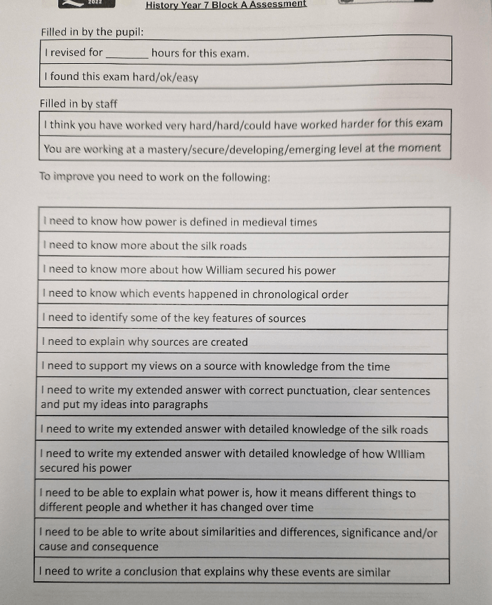 We have started cataloguing pupils’ work on Google classroom for the past few years. By asking the same big question at the same time of year across Key Stage 3 it is really easy to see how pupils’ knowledge, use of disciplinary language and expression of that knowledge through second order concepts has progressed. Pupils receiving feedback are no longer focussed on where they have ‘lost marks’ and therefore see improvement as small steps while still being focussed on the bigger picture of their development.