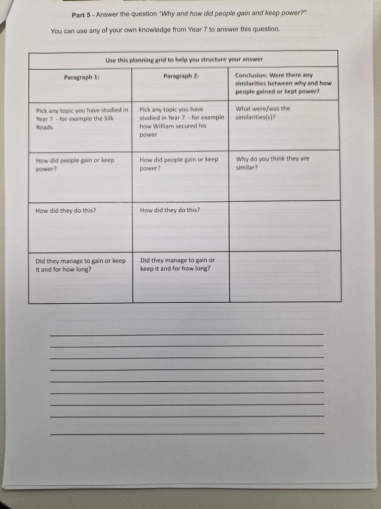 To help break out of this mindset, I decided to create an assessment that had no marks awarded. We changed our key word match up to just asking pupils for their understanding of them but kept most of the other sections. The two main changes were that we asked all of key stage 3 the same question ‘How and why do people gain and keep power’ but invited pupils to give evidence from any part of history they knew and we changed how we assessed them. Here is the Year 7 example of this final question on the assessment: