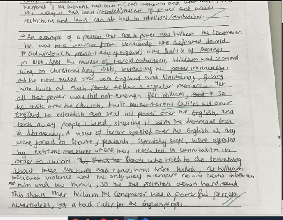 Where we probably differ from most is in the extended writing section of our exams. Based on how we have sequenced our curriculum and the themes that are developed within lesson sequences, we have been able to ask Year 7, 8 and 9 the same extended essay question at the same point in each year. For example in November of Year 7, 8 and 9 they all answered the question ‘How did people gain and keep power?’. By answering the same question you can directly see their progress in gaining historical knowledge as they go through KS3. The essay also gives pupils an opportunity to showcase their understanding of how the threads that are interwoven throughout the curriculum fit together.