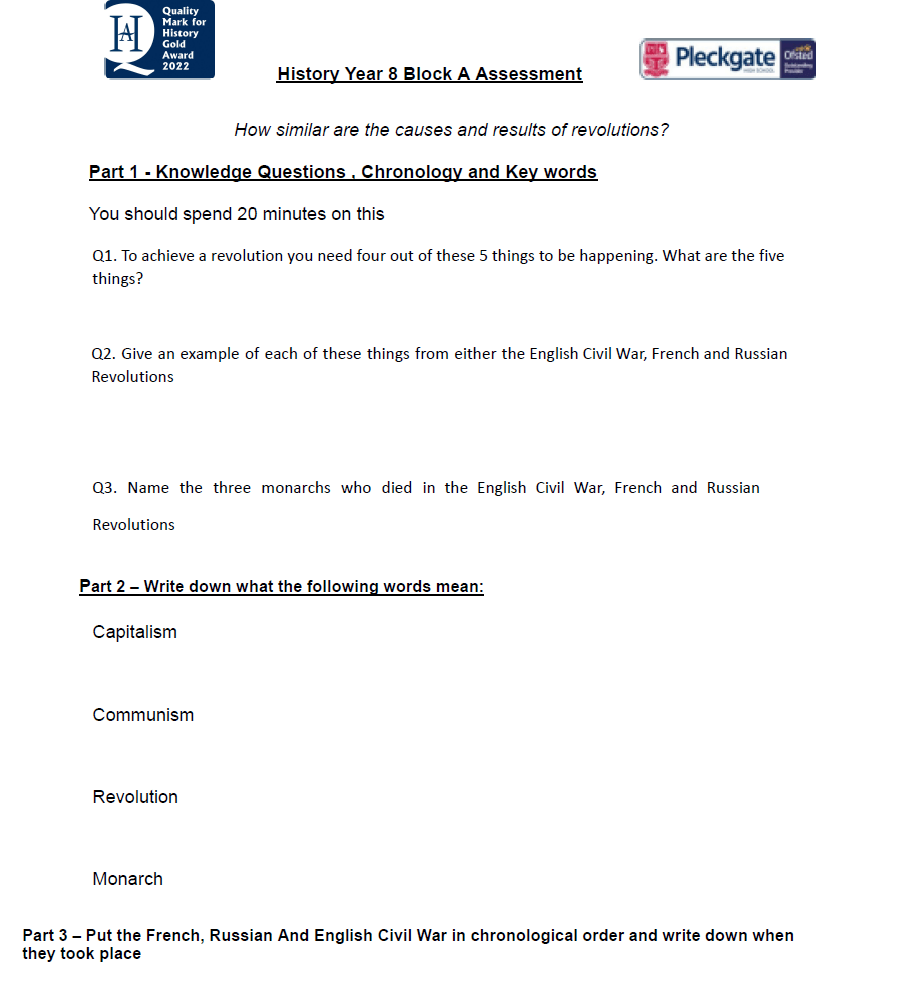 ● An exam that tested recently gained substantive knowledge, developing understanding of key concepts, chronology and source analysis