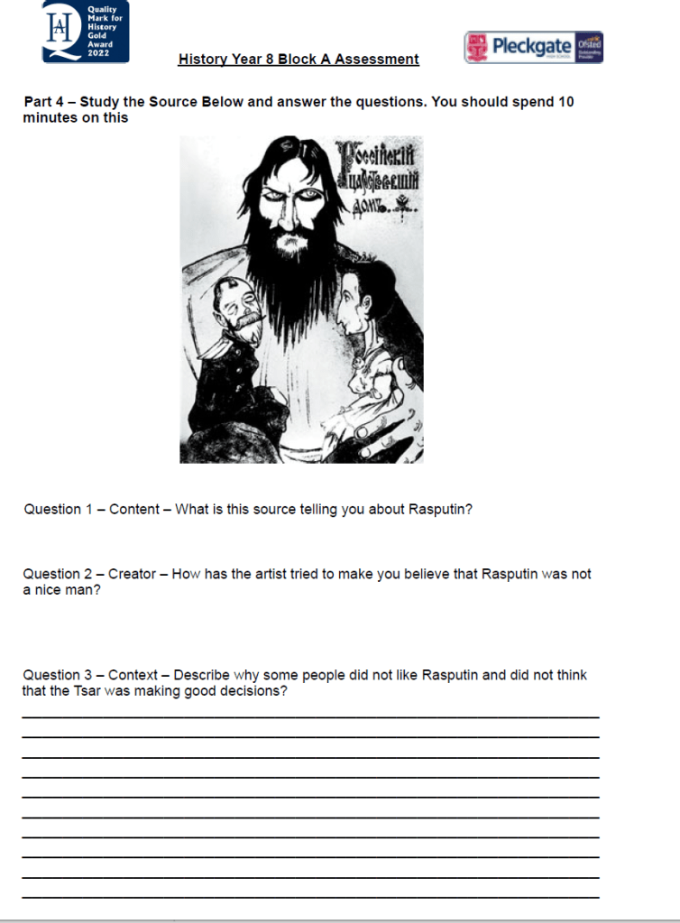 For the sake of brevity within this blog I Imagine that you and your departments have definitely got the first two bullet points nailed. Our exams, again probably similar to yours, ask pupils from simple knowledge recall based on their last sequence of learning with a couple of questions thrown in from a previous sequence. We then have a concept section where they have to articulate what their understanding of say capitalism, communism, protest and power are. We have chosen key concepts woven into our curriculum and they always appear on at least two exams. This is important for us as this is not a mix and match activity, but a chance for them to demonstrate their (hopefully) increasing understanding of the concept based on newly acquired contextual knowledge. We have a source question (using Hugh Richard’s ‘Content, Creator and Context’ framework) and these sources are tiered in difficulty as they progress through KS3. We use artefacts/paintings in Year 7, propaganda in Year 8 and political satire in Year 9. Not because one type of source is easier or harder than the other, but to ensure the range of sources we use. Again I am sure that a lot of departments do something similar.