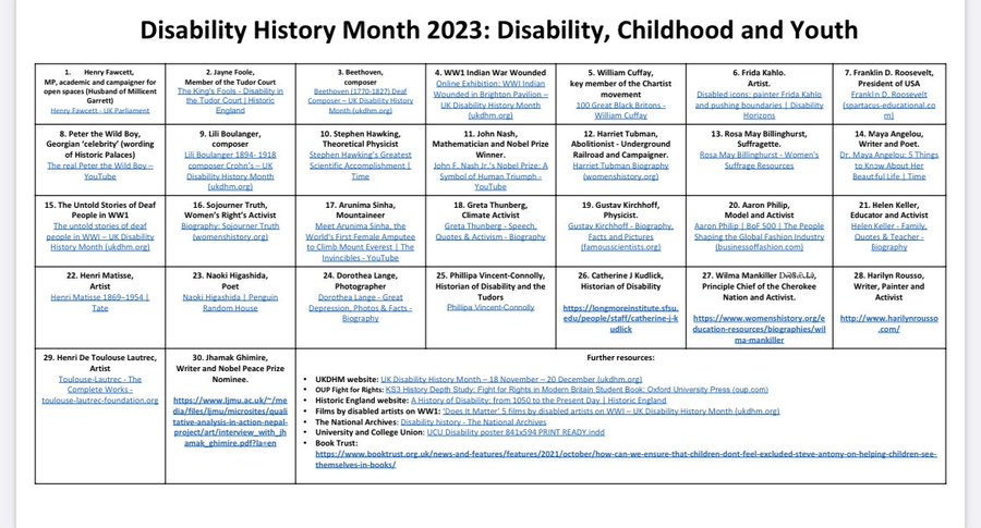 Disability history is an important thread to have woven into our curriculums. Through careful consideration within departments, it can be effectively and meaningfully woven in so that enquiries can be broadened and so that previously unknown narratives can be shared with our pupils. As mentioned earlier, one of the key things to secure before embarking upon threading through disability history is how you frame and discuss disability as a team and with the pupils. Moreover, how do you ensure that the narratives that you include are meaningful and align with appropriate representations of disabled history including language and imagery (avoiding the mistakes of inspiration porn etc.)