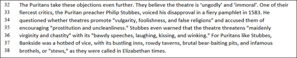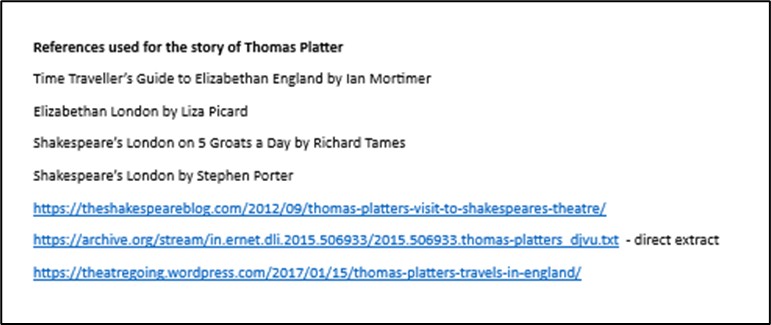 One example is our use of Thomas Platter’s diary to explore Elizabethan theatre. Rather than analysing short extracts in isolation, we built the story around his experience of attending a play in London. His vivid descriptions were used to frame the sensory world of the theatre — from the smells and sounds to the energy of the crowd, and the intriguing story of the fireworks attached the monkey. When teachers point out these embedded sources during the story, it helps students connect knowledge, evidence, and narrative in a meaningful way.