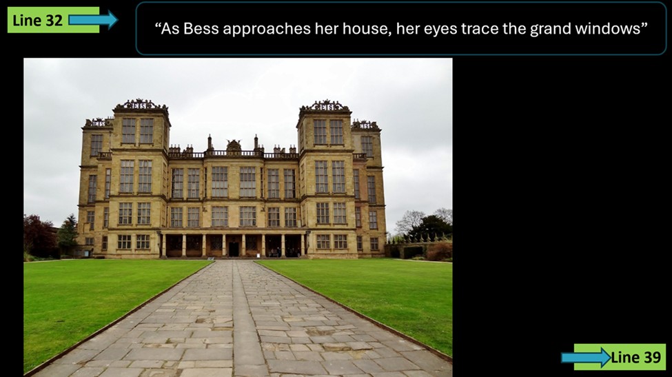 Using PowerPoint to share rich images on the story really helps to build worlds for the students. Having images appear on the screen during the storytelling and giving students time to pause, reflect and create an ‘imagined world’ has been hugely beneficial in making the stories land. Here’s an example from our Bess of Hardwick story.