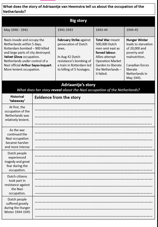Our story of Audrey Hepburn highlights how we are able to make the occupation, much more concrete. By showing smaller details about flowers blooming, and ballet performances still continuing, it shows the softer side to occupation initially, but the details surrounding her uncle Otto’s arrest shows the direct link between resistance and escalating brutality. We feel that it is only because students have followed Adriaantje’s journey, that they gain the fingertip knowledge that helps them engage meaningfully with complex questions about occupation, collaboration, and resistance.